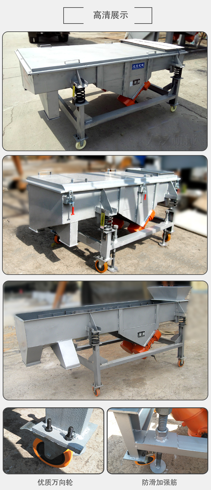產品摘要:可移動直線篩又叫做可移動式直線篩,支腿加萬向輪及支架,可自由移動可隨意升降,方便客戶根據現(xiàn)場需要隨時調節(jié)。