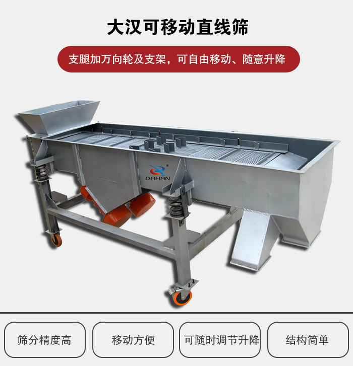可移動直線篩又叫做可移動式直線振動篩,支腿加萬向輪及支架,可自由移動可隨意升降,方便客戶根據現(xiàn)場需要隨時調節(jié)。進料口加裝分料器,緩沖物料對篩面的沖擊,物料均勻的投入篩面,可提高篩分效率。